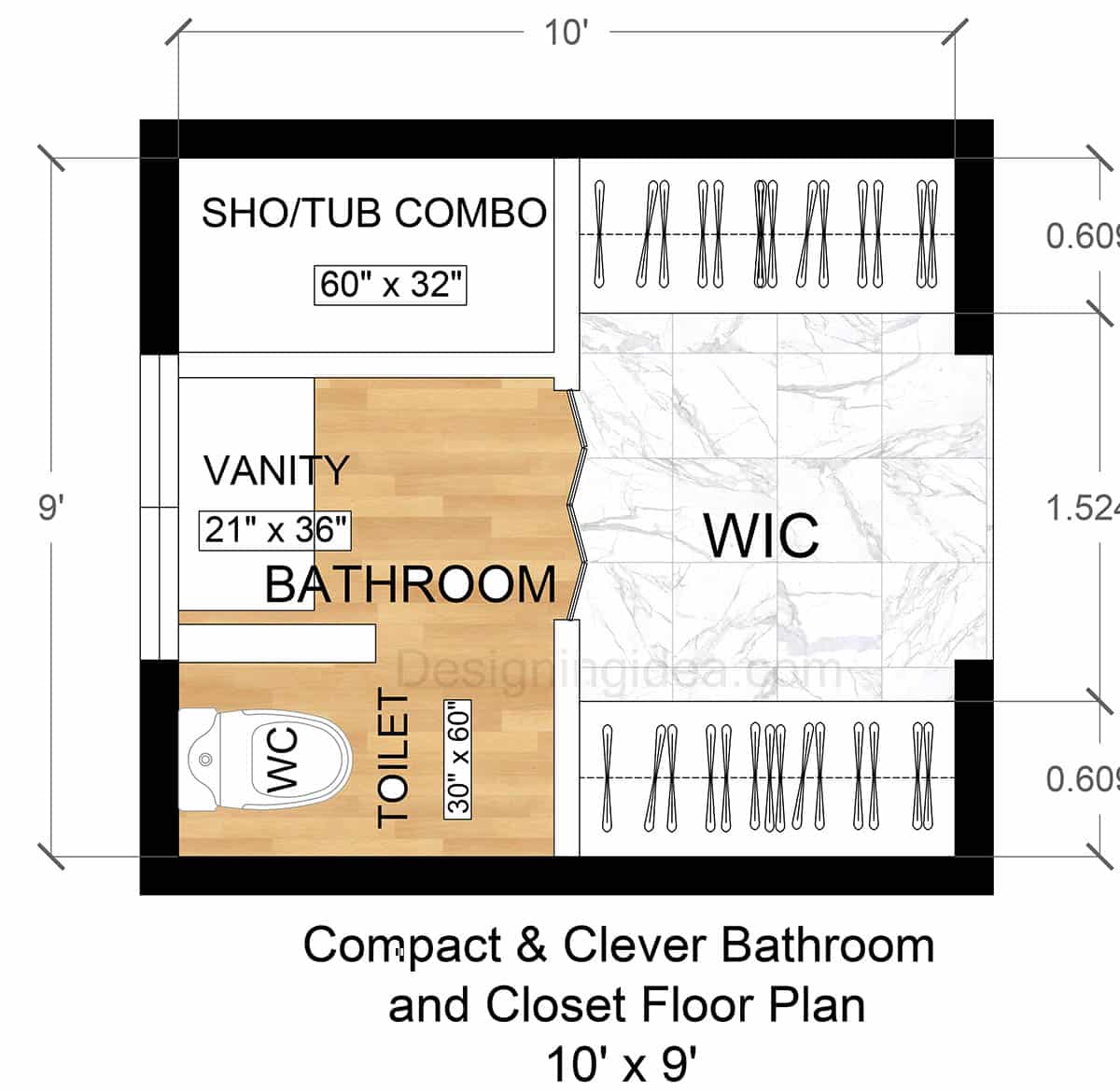Layout Details: This bathroom and closet combo squeezes a full three-piece bath and a walk-in closet into just 90 sq ft by stacking fixtures along one wall and carefully planning the storage arrangement. You enter on the right into a slender but functional closet with 24″-deep clothing rods on either side. A 60″ center aisle lets you step back to view outfits or tag-team dressing without bumping into your significant other. Continuing through the closet, you enter the bathroom and find the 30″-wide toilet alcove sits immediately to your left, screened on the vanity side by a half-height privacy wall. Next to the toilet sits a 36″ × 21″ floating vanity with a mirrored cabinet. The upper side hosts a 60″ × 32″ tub/shower combo that is ideal when you need both bathing options but don’t have room for a separate shower.