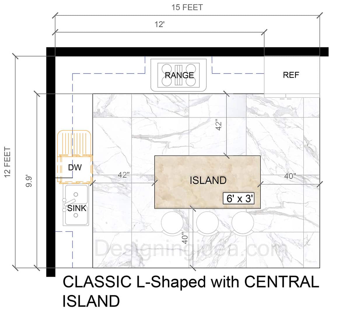Classic L-Shaped With Island 15′ × 12′ 6′ × 3′ island, 3 stools, prep and serving space Balanced family that wants seating and efficiency